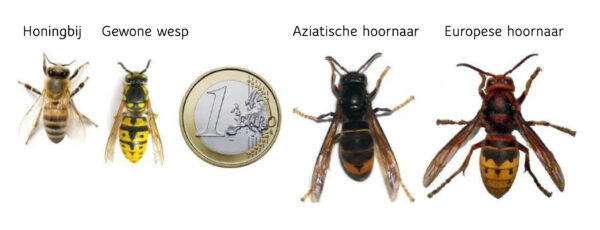 De Aziatische hoornaar (Vespa velutina) is een invasieve uitheemse soort en is sinds kort gevestigd in België. Ze wordt 25 tot 30 mm groot. Ze is overwegend zwart waarbij de uiteinden van de poten geel zijn en het achterlijf ook één gele band heeft. De Aziatische hoornaar maakt twee soorten nesten. Het primaire nest wordt in het voorjaar gemaakt en is ongeveer ter grote van een basketbal. Deze wordt het vaakst terug gevonden nabij menselijke activiteiten, zoals onder een afdak of in een haag. Dit maakt dat ze makkelijk kunnen worden verstoord en een risico op steekgevaar betekenen. Deze nesten dienen best zo snel mogelijk te worden verdelgd door een professionele verdelger. Vanaf de zomer maken Aziatische hoornaars secundaire nesten. Deze zijn vaak terug te vinden op grote hoogte (20 à 30 meter) en kunnen een meter diameter bereiken. Dit nest veroorzaakt echter minder steekgevaar omdat deze minder kans hebben om verstoord te worden. Voorzichtigheid is echter steeds geboden. Verdelging dient te gebeuren door een professionele verdelger. Steken van een individuele Aziatische hoornaar zijn te vergelijken met de inheemse. Meer info over de Aziatische hoornaar en de regeling rond verdelging kan je terugvinden op www.vespawatch.be.